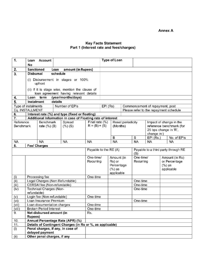 All such charges will be disclosed clearly in the loan documentation with the borrower, including in the key facts statement and shall not be charged unless disclosed in the Key Facts Statement (provided pursuant to RBI Guidelines on Digital Lending dated September 02, 2022 and RBI Circular dated April 15, 2024 on Key Fact Statements for Loans and Advances).