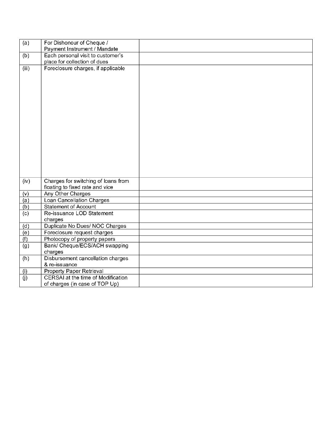 • Besides interest, other financial charges like processing fees, cheque bouncing charges, prepayment/ foreclosure charges, part disbursement charges, cheque swaps, cash handling charges, RTGS/ other remittance charges, commitment fees, charges on various other services like issuing NO DUE certificates, NOC, letters ceding charge on assets/ security, security swap & exchange charges etc. would be levied by the company wherever considered necessary. Besides the base charges, the GST and other cess would be collected at applicable rates from time to time. Any revision in these charges would be with prospective effect. These charges would be decided upon collectively by the management of the Company.