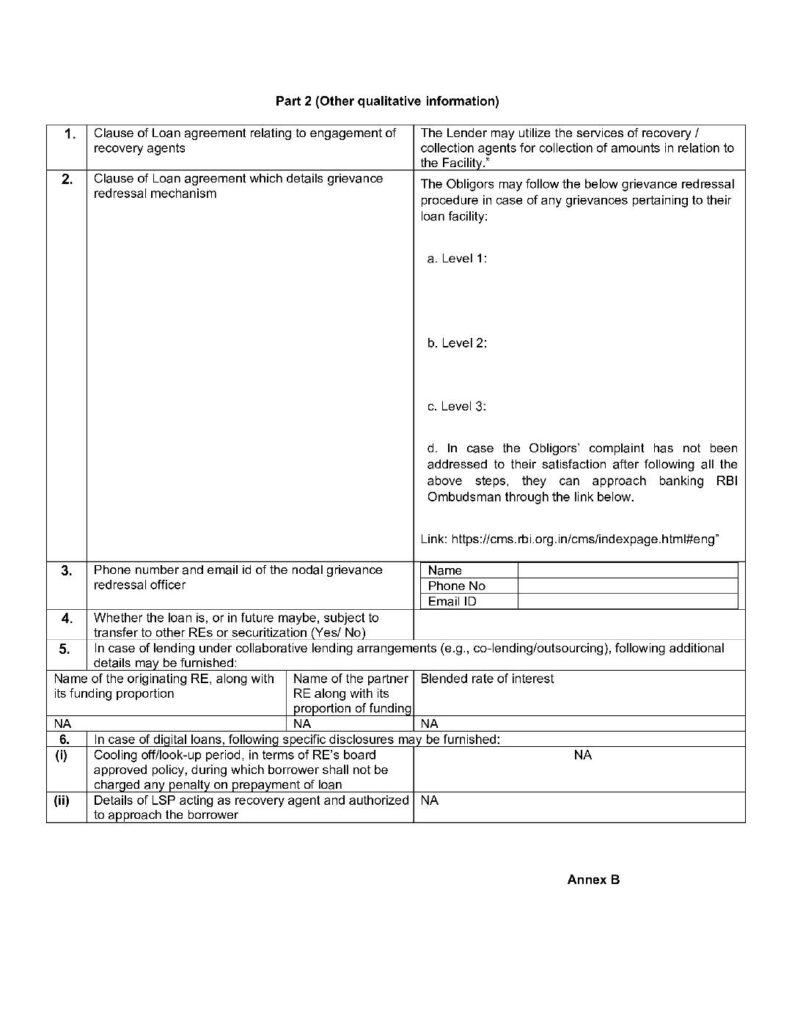 • Disclosure requirements: The quantum and reason for penal charges shall be clearly disclosed by the Company to the customers in the loan agreement and most important terms & conditions/Key Fact Statement (KFS) provided to them (pursuant to RBI Guidelines on Digital Lending dated September 02, 2022 and RBI Circular dated April 15, 2024 on Key Fact Statements for Loans and Advances) and the loan agreement. The same shall be displayed on websites of NBFCs under Interest rates and Service Charges.