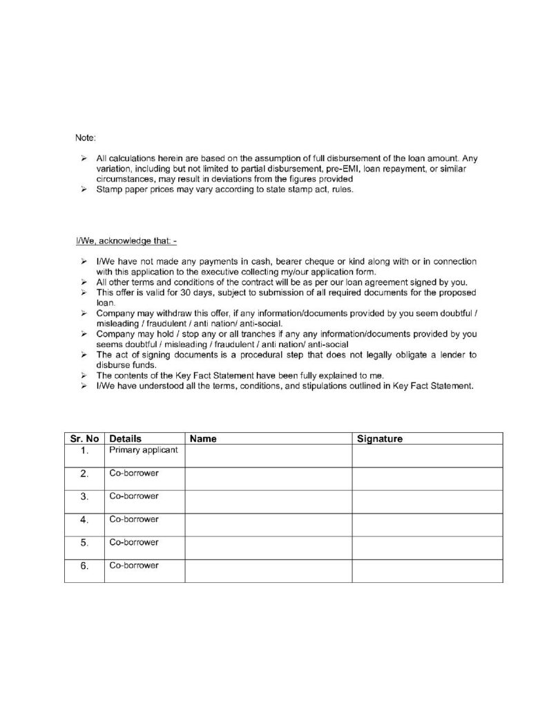 3. The Company shall provide a Key Facts Statement (KFS) to all prospective borrowers to help them take an informed view before executing the loan contract, as per the standardised format. The KFS shall be written in a language understood by such borrowers. Contents of KFS shall be explained to the borrower and an acknowledgement shall be obtained that he/she has understood the same.